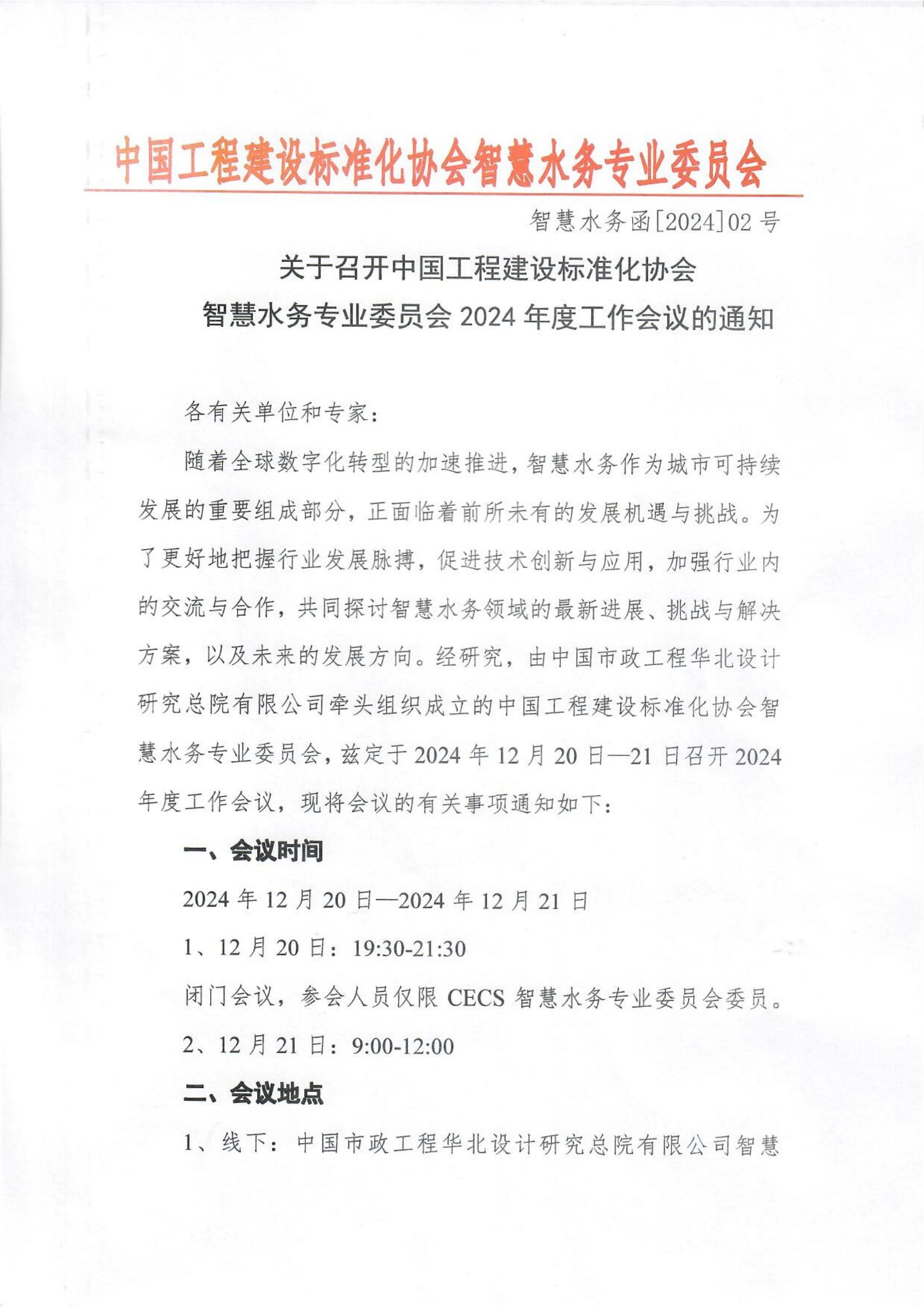 关于召开中国工程建设标准化协会智慧水务专业委员会2024年度工作会议的通知